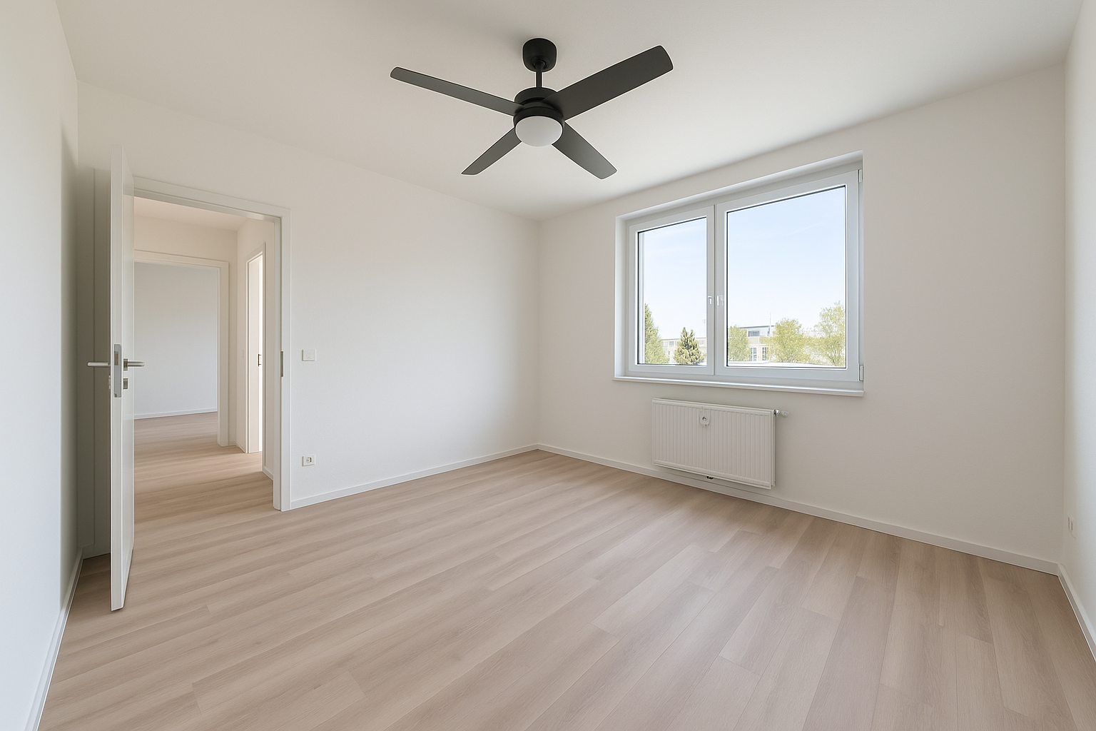 Helles Wohnzimmer mit bodentiefen Fenstern und direktem Zugang zur Terrasse