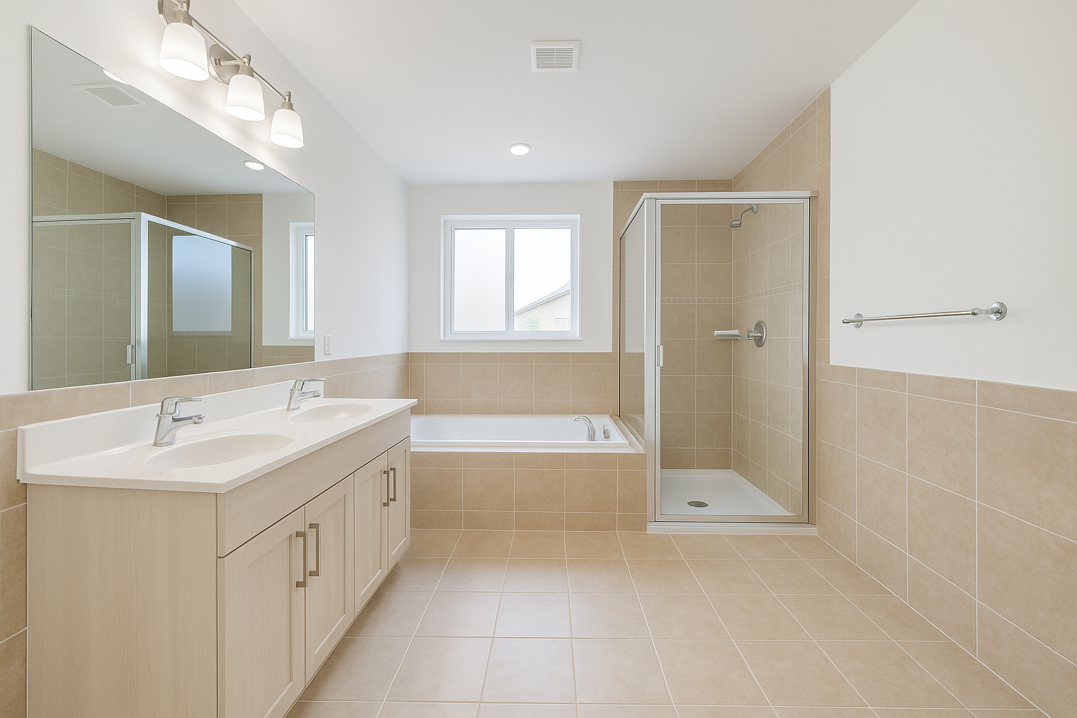 Modernes Tageslichtbad mit großer Dusche, Wanne und Doppelwaschtisch